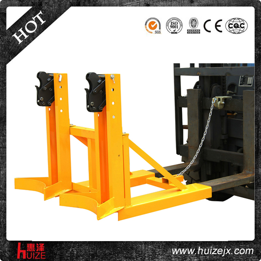 適用于桶邊薄和變型的桶,純機械機構(gòu)設(shè)計可與叉車方便地配合,僅依靠叉車的動作,不需要其它的動力,可自動一次搬運2個桶,能處理更多類型的桶,包括鋼制油桶和塑料油桶,能在集裝箱等這樣狹小的環(huán)境內(nèi)裝卸桶裝物質(zhì),可極大地提高空間利用率, 與貨叉連接配有自鎖裝置確保油桶夾在坡度上和顛簸路面使用時不會滑落.